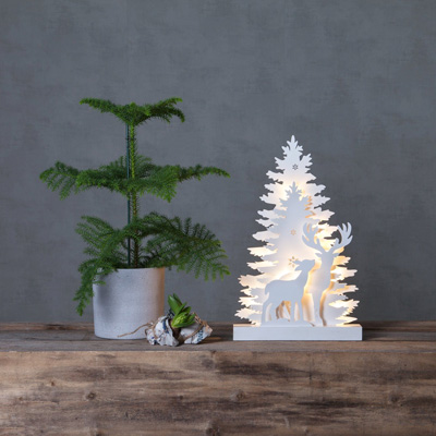 Decoración navideña LED elaborada en madera, tiene abetos y renos iluminados en una agradable y cálida luz blanca. El refinado diseño convierte a esta lámpara navideña en el elemento decorativo ideal...