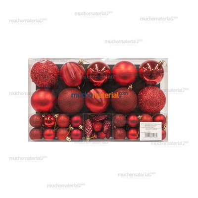 Paquete de 50 esferas en acabado diamantado, mate y texturizado en color rojo y vino. Incluye 10 esferas de 8 cm de diámetro, 32 esferas de 4 cm de diámetro y 8 piñas de 6 cm. Ideales para decorar árb...