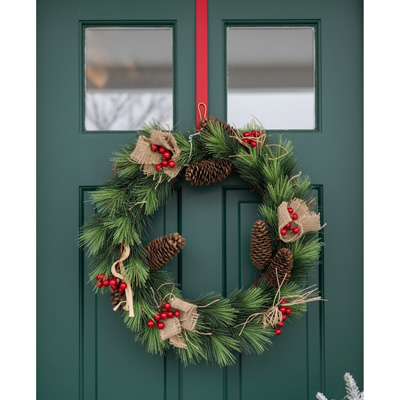 CORONA CON FOLLAJE VERDE Y PIÑAS CON CEREZAS 40cm