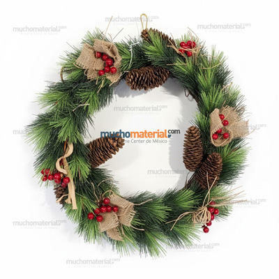 CORONA CON FOLLAJE VERDE Y PIÑAS CON CEREZAS 40cm