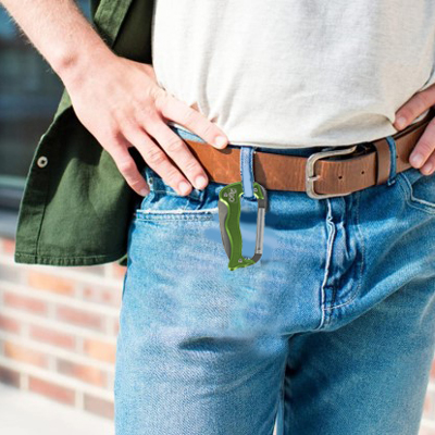 Cuchillo carabiner cuenta con una navaja de 1.75” disponible de un cierre completo que posibilita engancharlo en las trabillas o correas del pantalón de manera segura.