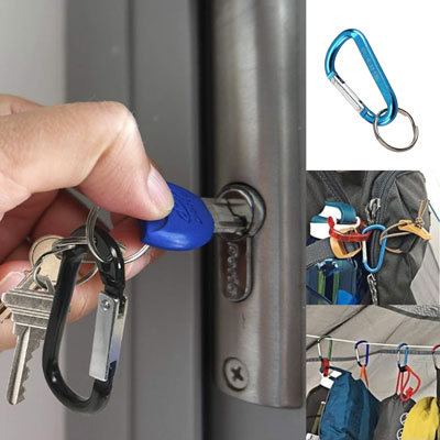 Mosquetón con 3 argollas que permiten la organización de llaves u objetos pequeños.