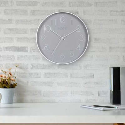 Reloj de pared de estilo moderno con números en relieve que le dan un toque elegante y fácil de leer. Fabricado con un marco de plástico resistente en color gris claro, combina durabilidad y estética...