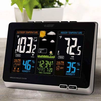 Mide la temperatura y la humedad de entrada/salida con registros diarios min/máx. Todo en una pantalla a color fácil de leer con brillo ajustable.