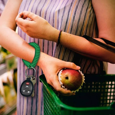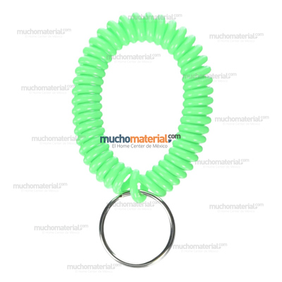 Llavero de plástico para enrollar en la mano, es color neón para facilitar su búsqueda. Al estirar cuenta con una longitud de 30.5 cm.