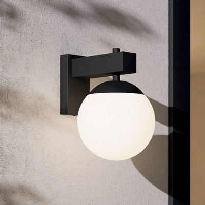 Lámpara de pared para exteriores con diseño moderno y elegante, fabricada en acero negro con pantalla de plástico blanco. Ofrece resistencia a salpicaduras y es ideal para iluminar entradas, terrazas...