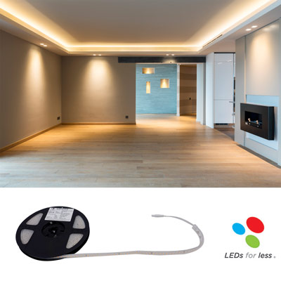 La tira de LED 7 Watts blanco frio 3000 °K flexible es sólo para uso interior. Ilumina diversos espacios u objetos, contiene cinta autoadherible.