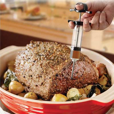 La herramienta perfecta para mantener la carne húmeda para cocinar o ahumar. Aguja extra larga que fácilmente se sumerge en la carne. Este fácil y rápido proceso permite una profunda infusión de condi...