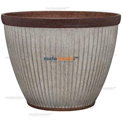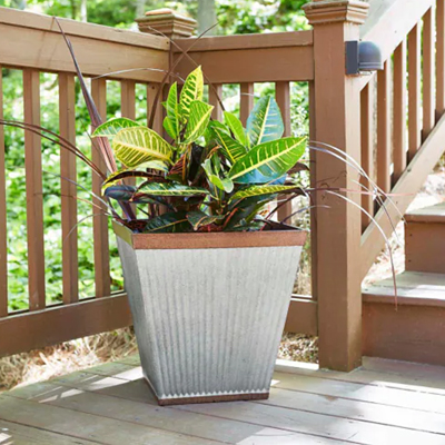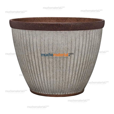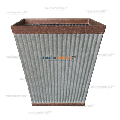 Maceta con apariencia de metal galvanizado, pero fabricada en material plástico resistente. Es ligera, duradera, ideal para decorar espacios exteriores.