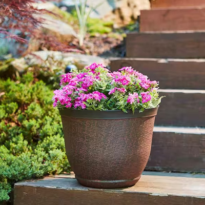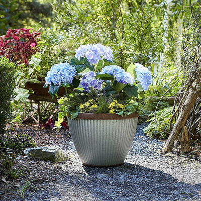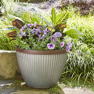 Maceta de diseño rústico con acabado galvanizado envejecido. Fabricada en plástico resistente, es ligera y duradera, ideal para decorar espacios exteriores.