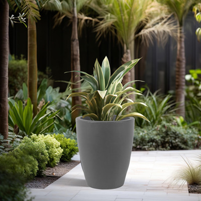 Maceta coniforme con una gran base de plantación. Fabricada en polietileno de alta calidad, ideal para plantas medianas o grandes.