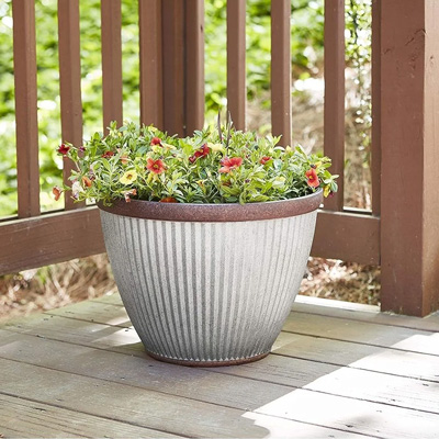 Maceta con apariencia de metal galvanizado pero fabricada en material plástico resistente. Su diseño rústico y envejecido aporta un estilo vintage ideal para decorar cualquier espacio, tanto en interi...