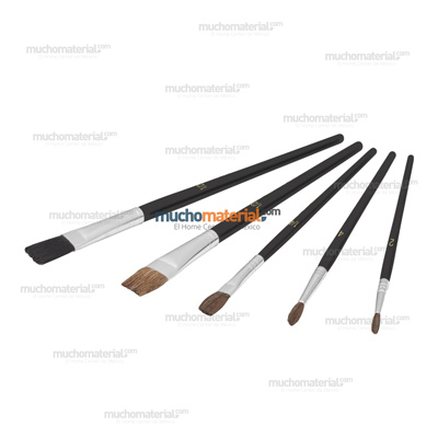 Juego de brochas de artista de cinco piezas compuestas por pinceles planos y redondos. Cepillos fabricados con cerdas de diversos materiales. Para uso con acrílicos, óleos, pasta, pegamento, témpera y...